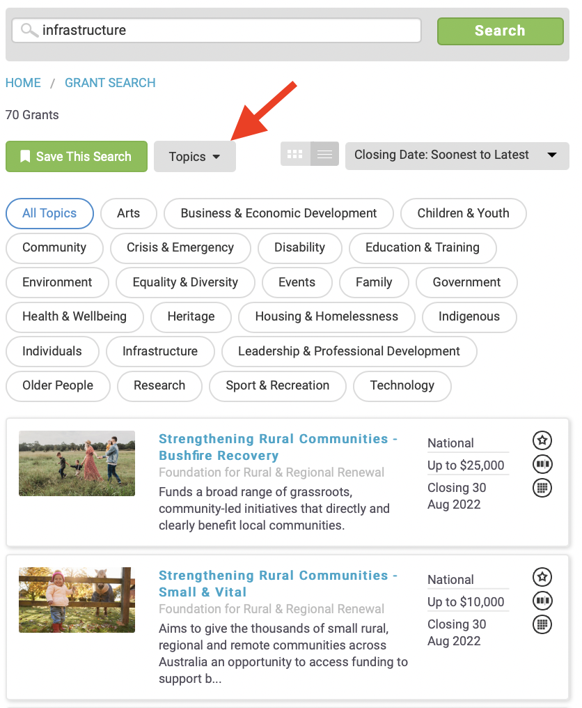 You can also refine your search by topic, which you’ll find by clicking the Grant Topic drop down menu.