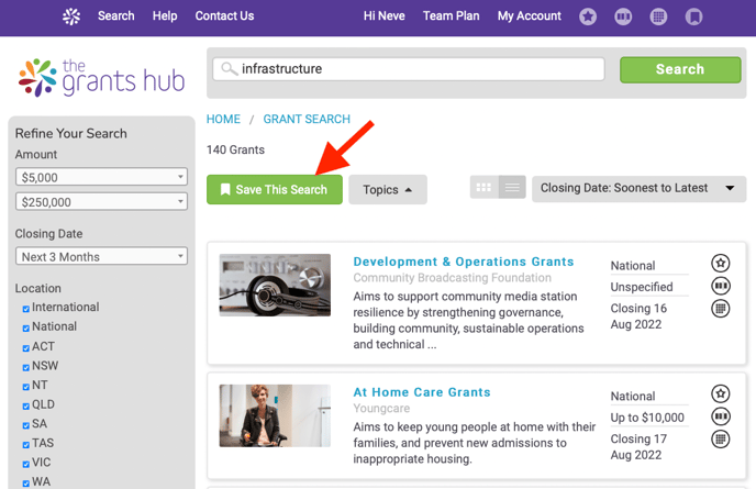 - Location, Grant Topics, and keyword searches can all be captured in your Saved Searches.