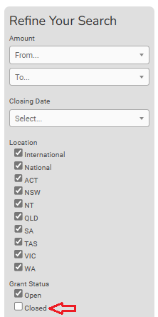 • To include Closed Grants in your search results, tick Closed under Grant Status in the Refine Your Search area